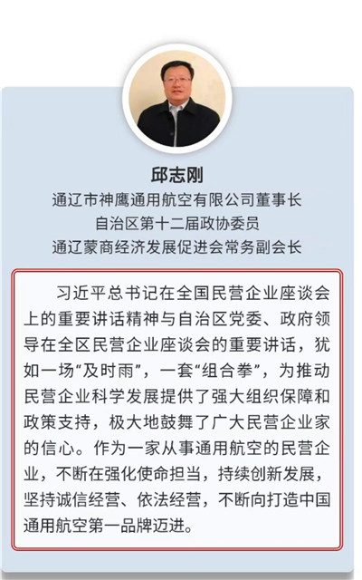 通遼市神鷹通用航空有限公司董事長、自治區(qū)政協第十二屆委員會委員邱志剛,作為自治區(qū)企業(yè)家代表應邀參加了此次座談會。會后,按照自治區(qū)統戰(zhàn)部的統一部署,提交了參加座談會的收獲與感受,表示:一定要認真貫徹布小林主席講話精神,不斷在強化使命擔當,持續(xù)創(chuàng)新發(fā)展,堅持誠信經營、依法經營上下功夫,不斷向中國通用航空第一品牌邁進。